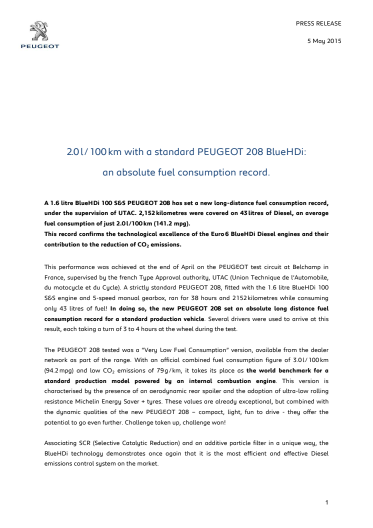 Med den nyutvecklade dieselmotorn, 1,6-liter BlueHDi med 100 hk, sätter Peugeot 208 nytt rekord i låg bränsleförbrukning. Under övervakning av UTAC körde en serietillverkad 208 hela 2 152 km på en tank med 43 liter diesel, vilket ger en genomsnittlig förbrukning på 2,0 l/100 km. Räckvidden motsvarar en bilresa från Stockholm till Rom.