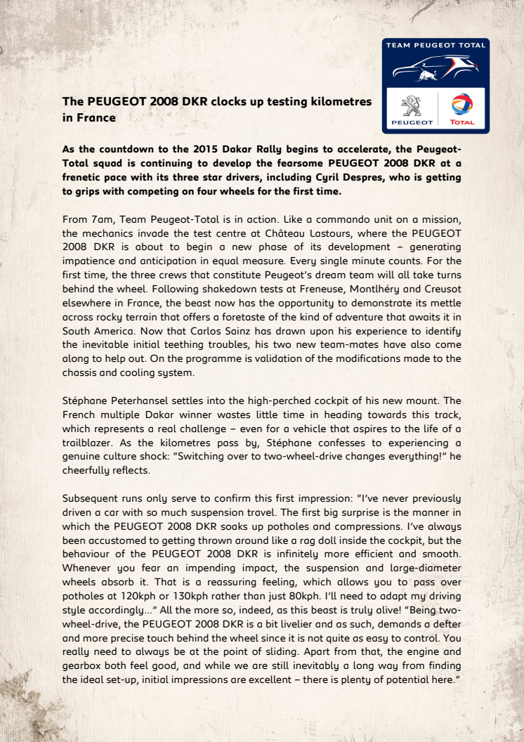 Nedräkningen till 2015 års Dakarrally har börjat. Team Peugeot-Total testar den djärva Peugeot 2008 DKR för fullt tillsammans med de tre stjärnförarna, Cyril Despres, Stéphane Peterhansel och Carlos Sainz.